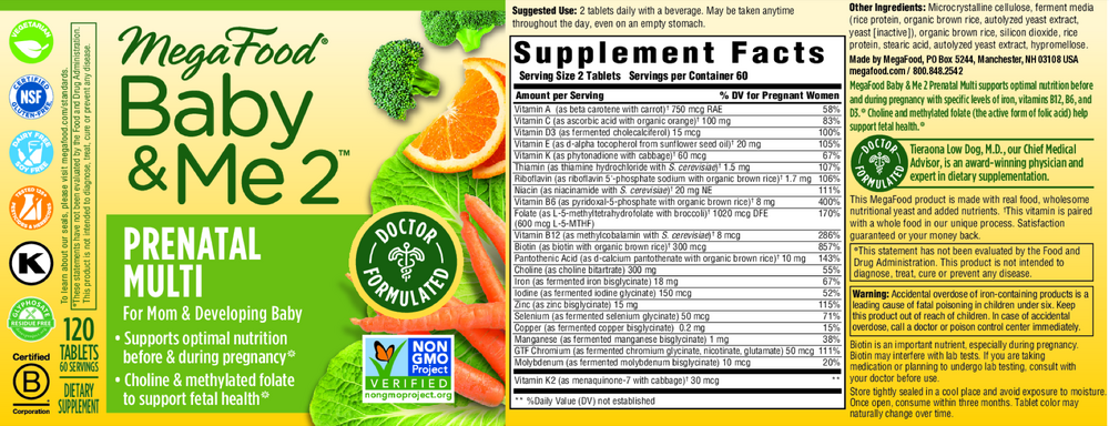 MOTHER. NURTURE. Nourish every month & milestone of your pregnancy journey* with Baby & Me 2™ Prenatal Multi. Formulated by award-winning women’s health expert, our prenatal multivitamin delivers added nourishment you need pre-conception through pregnancy with our unique pairing of key nutrients (like iron, D3, B12) with real food from trusted partners (like broccoli, and organic oranges & brown rice) to help support healthy red blood cell production* and healthy bones.* We also include methylated folate, the active form of folic acid, and choline to help support fetal health.* “A small but significant benefit of this prenatal is that you can take it anytime of day, even on an empty stomach - a big win during those early months when morning sickness may make an entrance.” - Dr. Erin Stokes, ND, Naturopath Doctor & MegaFood Medical Director *This statement has not been evaluated by the Food and Drug Administration. This product is not intended to diagnose, treat, cure or prevent any disease. Packaging switched from plastic to paper, aluminum, steel, or glass. Packaging contains recycled content and forever recyclable glass.