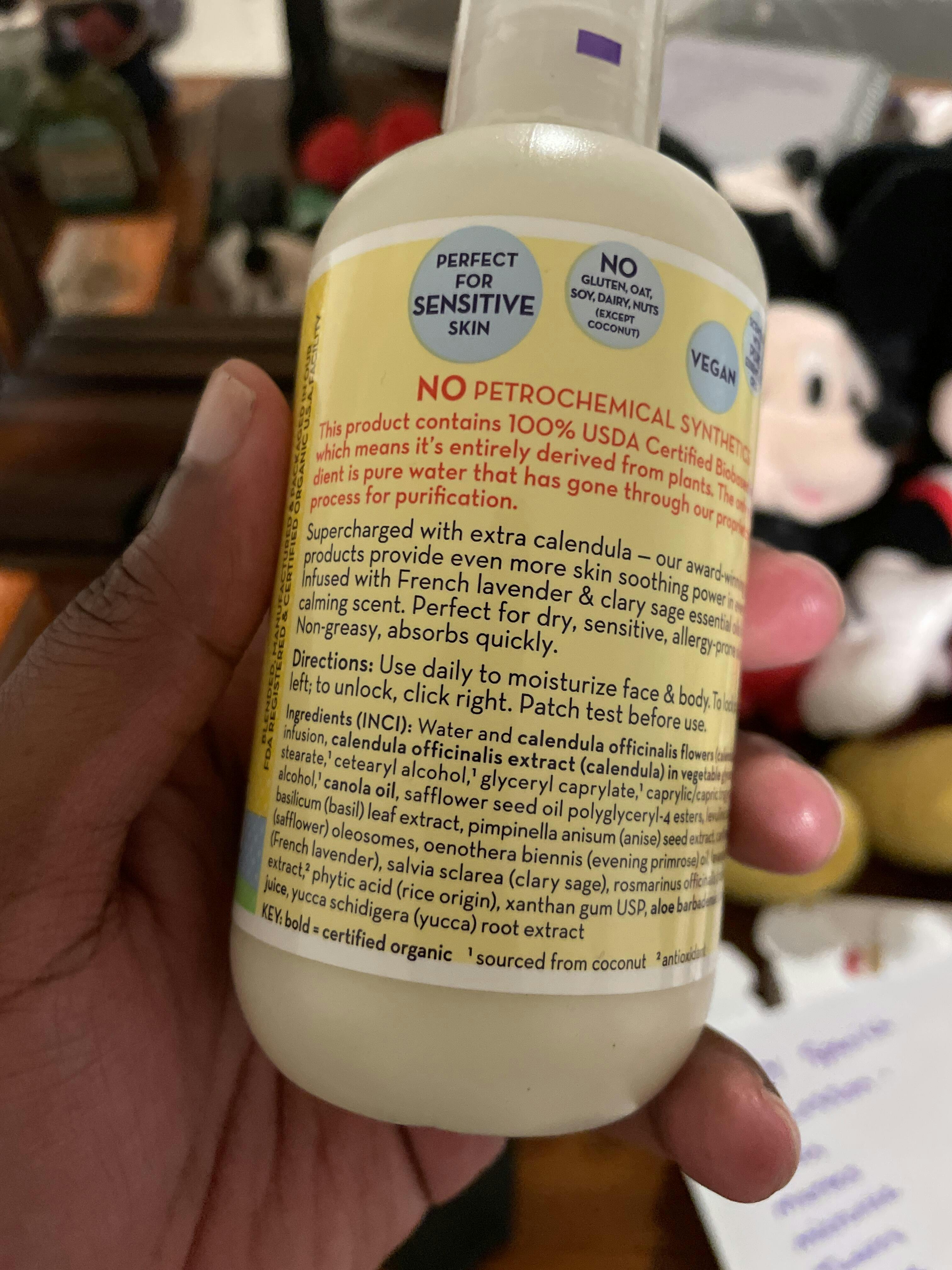 This super-soothing, luxurious, vegan lotion has a light, relaxing scent from French lavender and clary sage essential oils. Made with 100% plant-based ingredients that are not only better for sensitive skin and allergies, but also better for our planet. The star of the show is calendula, a flower famous for its soothing powers. To keep a watchful eye on this key ingredient, we grow all our calendula flowers on our own certified organic farm. Our entire Calendula collection is supercharged with extra calendula extract, bringing you more soothing relief in every bottle. Our irresistible scents are made from 100% pure essential oils and zero of the unknown and unlisted chemicals found in synthetic fragrances. This new lotion formula features our exclusive, 100% plant-based preservative system that we created after 6 years of research and development. This first-of-its-kind preservative system includes isolates of basil and anise (not essential oils) and is exclusive to California Baby products! Learn more here. . Save 20% by purchasing a half gallon! (compared to 8.5oz price per oz) .