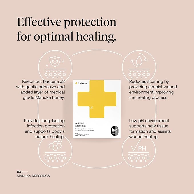 | Contains Healing 12+ Manukamed Medical Grade Certified Manuka Honey | Our First Honey Manuka Honey Patches contain a healing layer of 100% pure Manuka Honey. It has been certified as a medical grade honey, so it contains a high level of antibacterial activity to promote rapid healing of minor abrasions, lacerations, minor cuts, minor scalds, and burns.