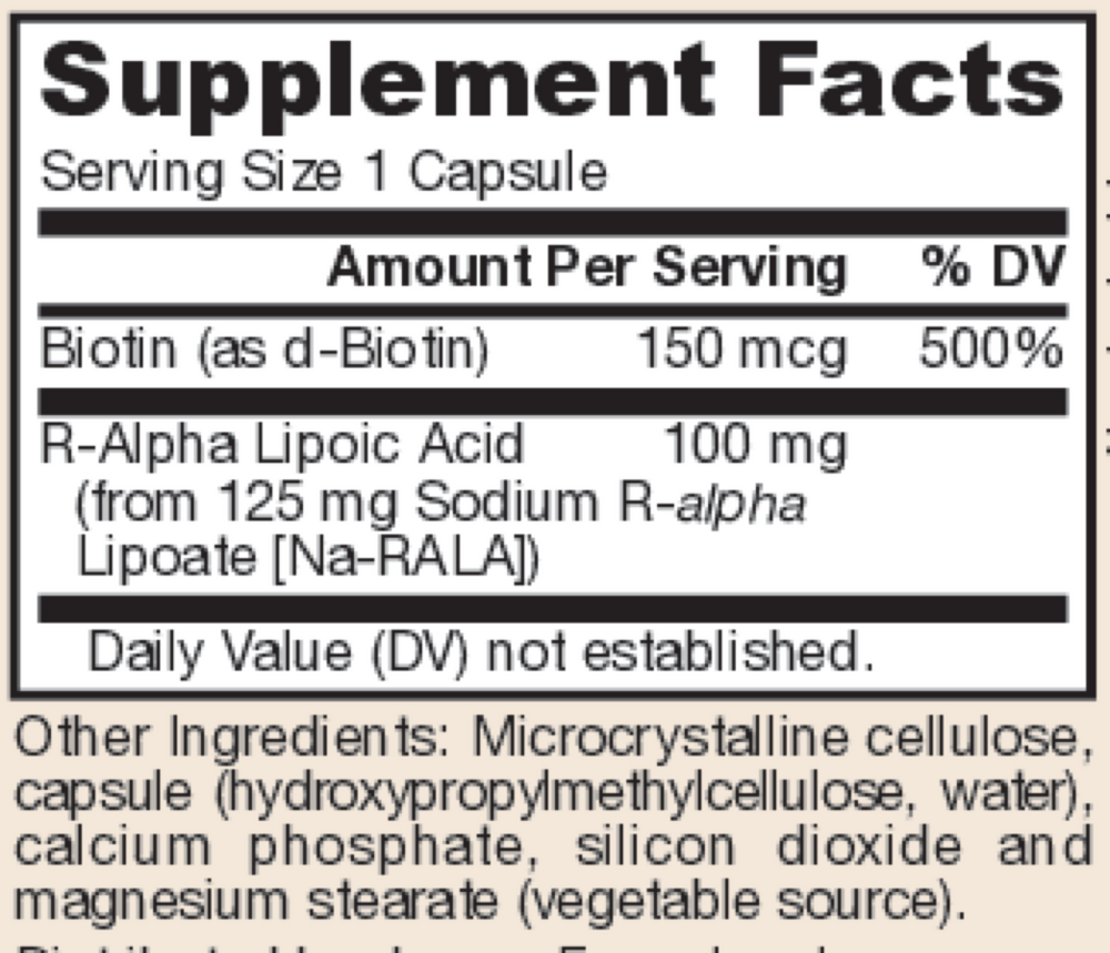 "Jarrow Formulas® R-Alpha Lipoic Acid (Bio-Enhanced® Na-RALA) exhibits high bioavailability and is the form of alpha lipoic acid found naturally in plants, animals, and the human body. RALA is an antioxidant and a cofactor in cellular energy production, as well as glucose and lipid metabolism.* We have included d-Biotin in this formula because it helps to prevent biotin deficiency from long-term alpha lipoic acid use.*"